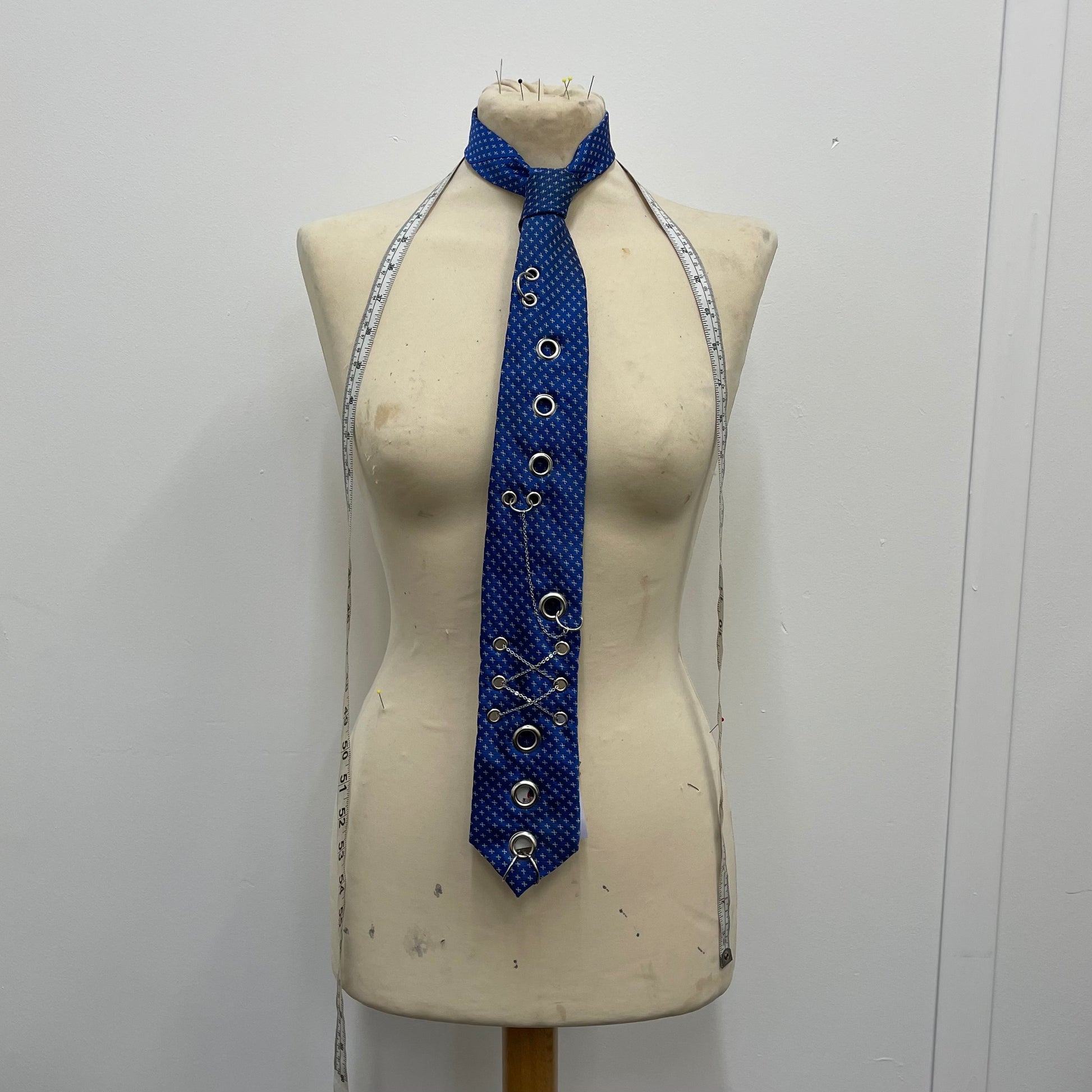 Upcycled tie with chain corset detailing, eyelets and hoops.