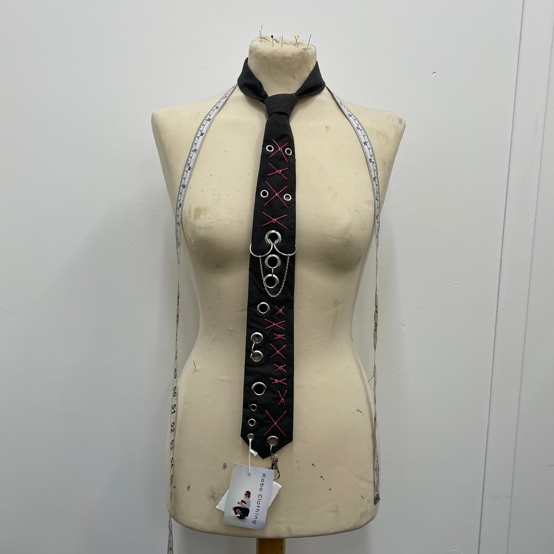 Upcycled slim cotton tie with pink cross stitch detailing, eyelets, hoops and drop chain.