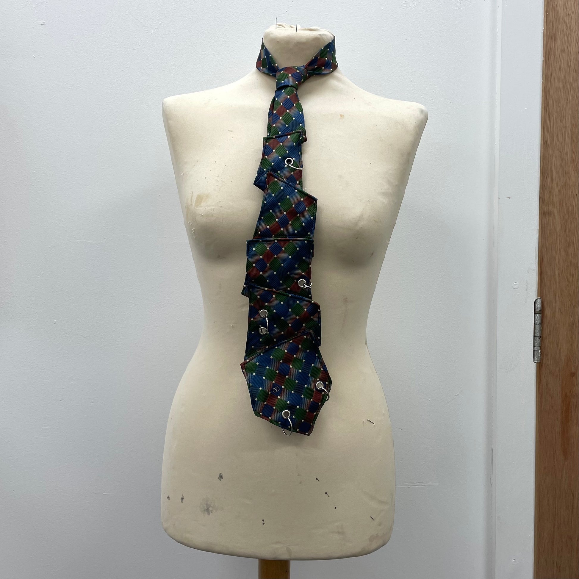 Upcycled geometric print print with disjointed sections, eyelets and hoops.