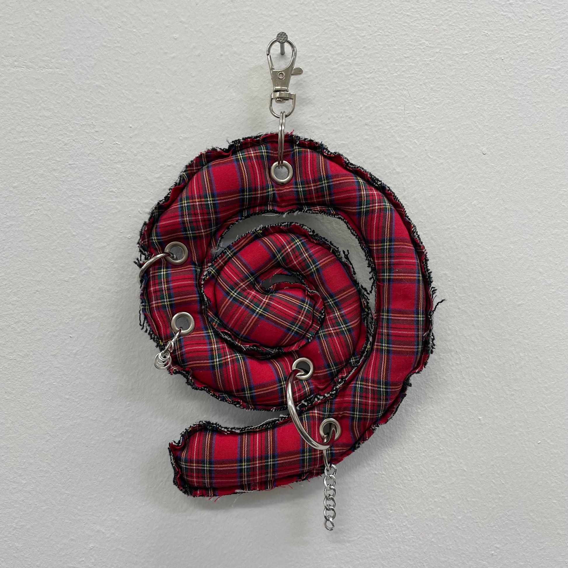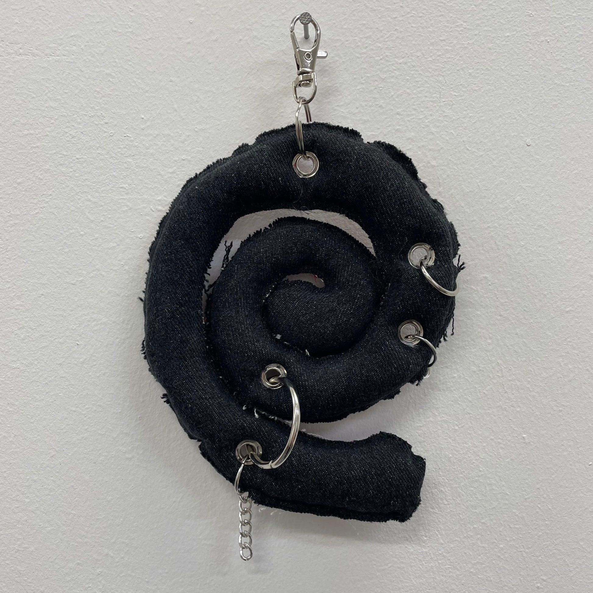 Double sided oversized scrappy keyring with chains and hoops. Made from repurposed materials.