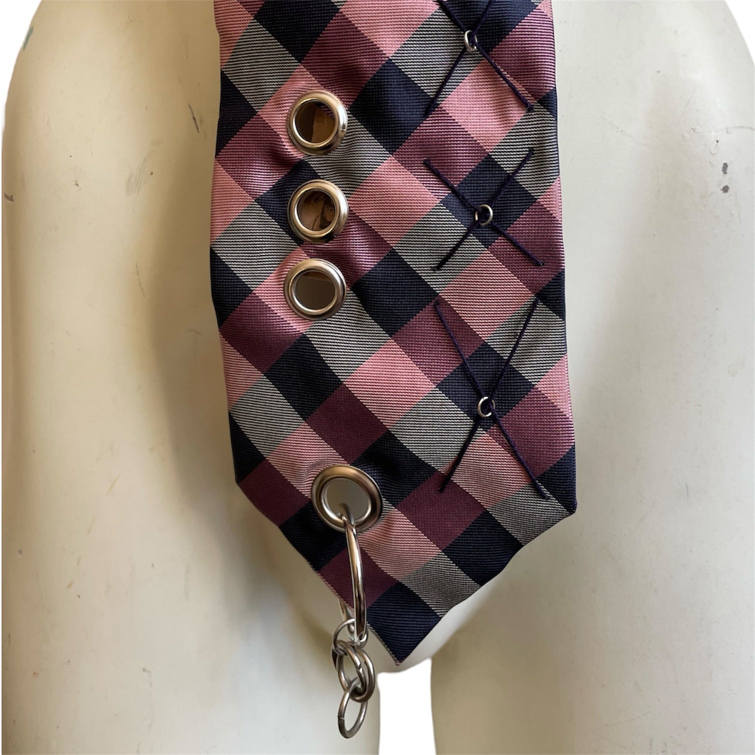 Pink and navy/purple plaid silk tie with cross stitch detailing, eyelets and hoops.