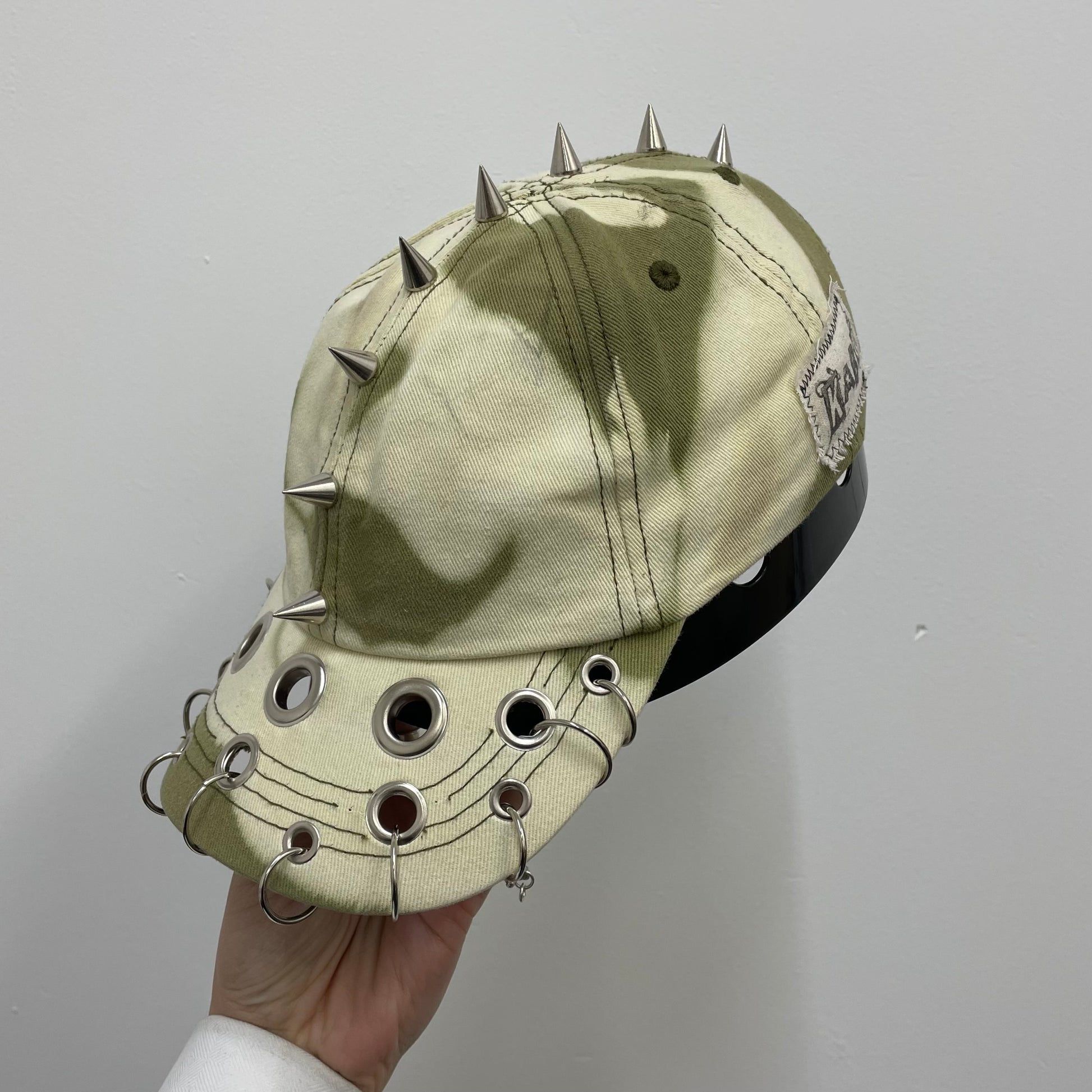 Upcycled bleached khaki cap with eyelets, hoops and spikes. Adjustable size.